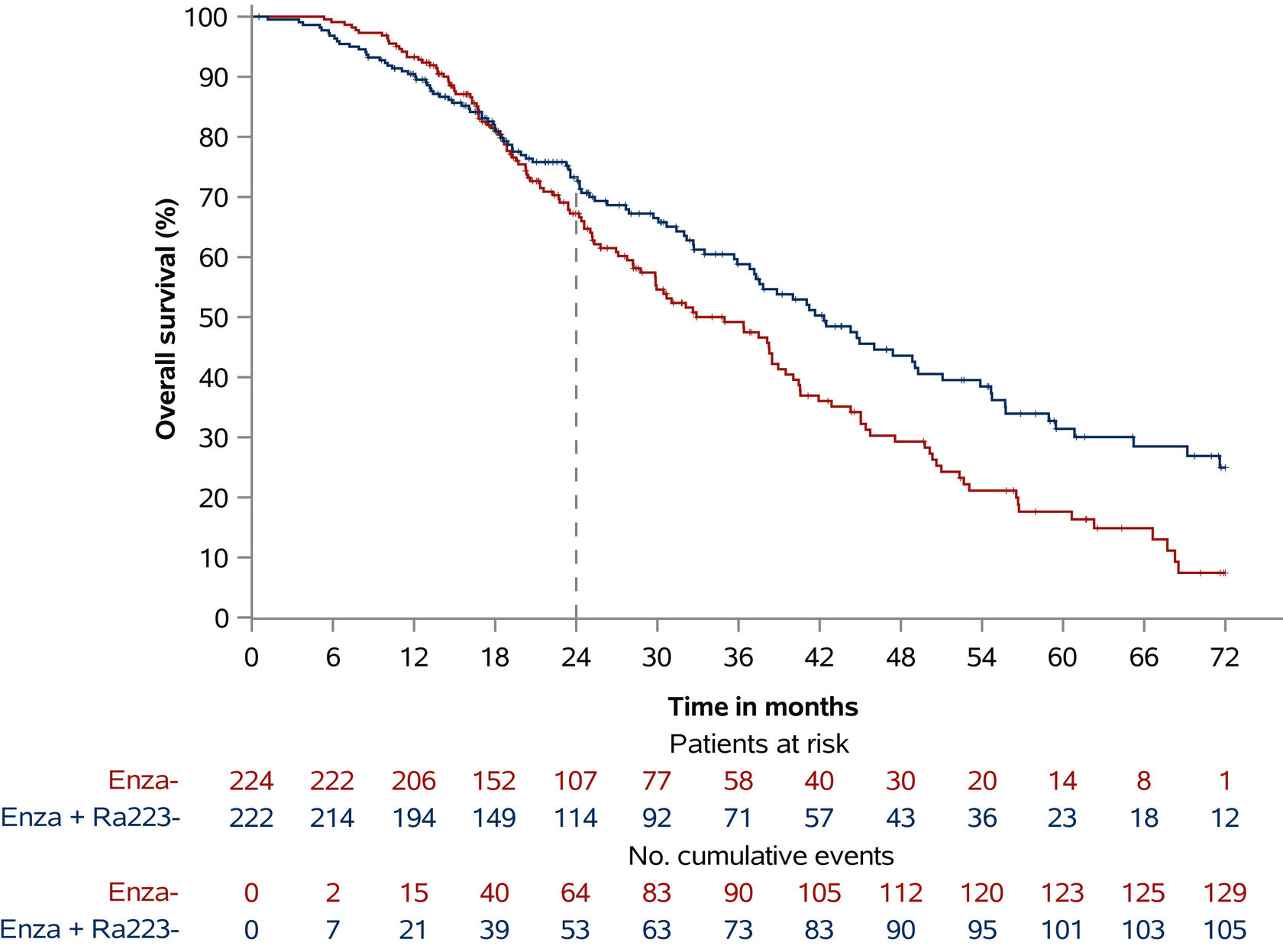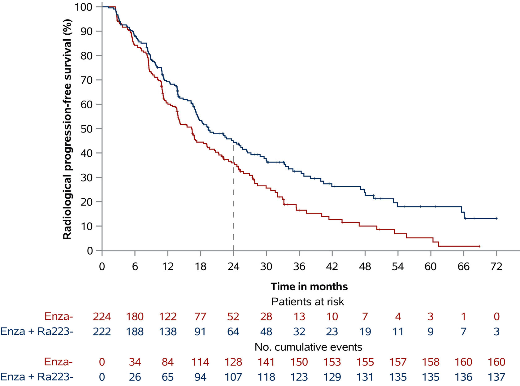 С ноября 2015 по март 2023 года 446 пациентов, включая 11, получавших абиратерон, были рандомизированы на группы, получавшие энзалутамид (без плацебо) или энзалутамид в сочетании с шестью циклами Ra223. С марта 2018 года было обязательным одновременное применение золедроновой кислоты или деносумаба. Первичной конечной точкой была выживаемость без радиологического прогрессирования заболевания (рВБП) по оценке исследователя. Ключевые вторичные конечные точки включали общую выживаемость (ОВ), время до последующего системного лечения, прогрессирование боли и симптоматические скелетные осложнения.