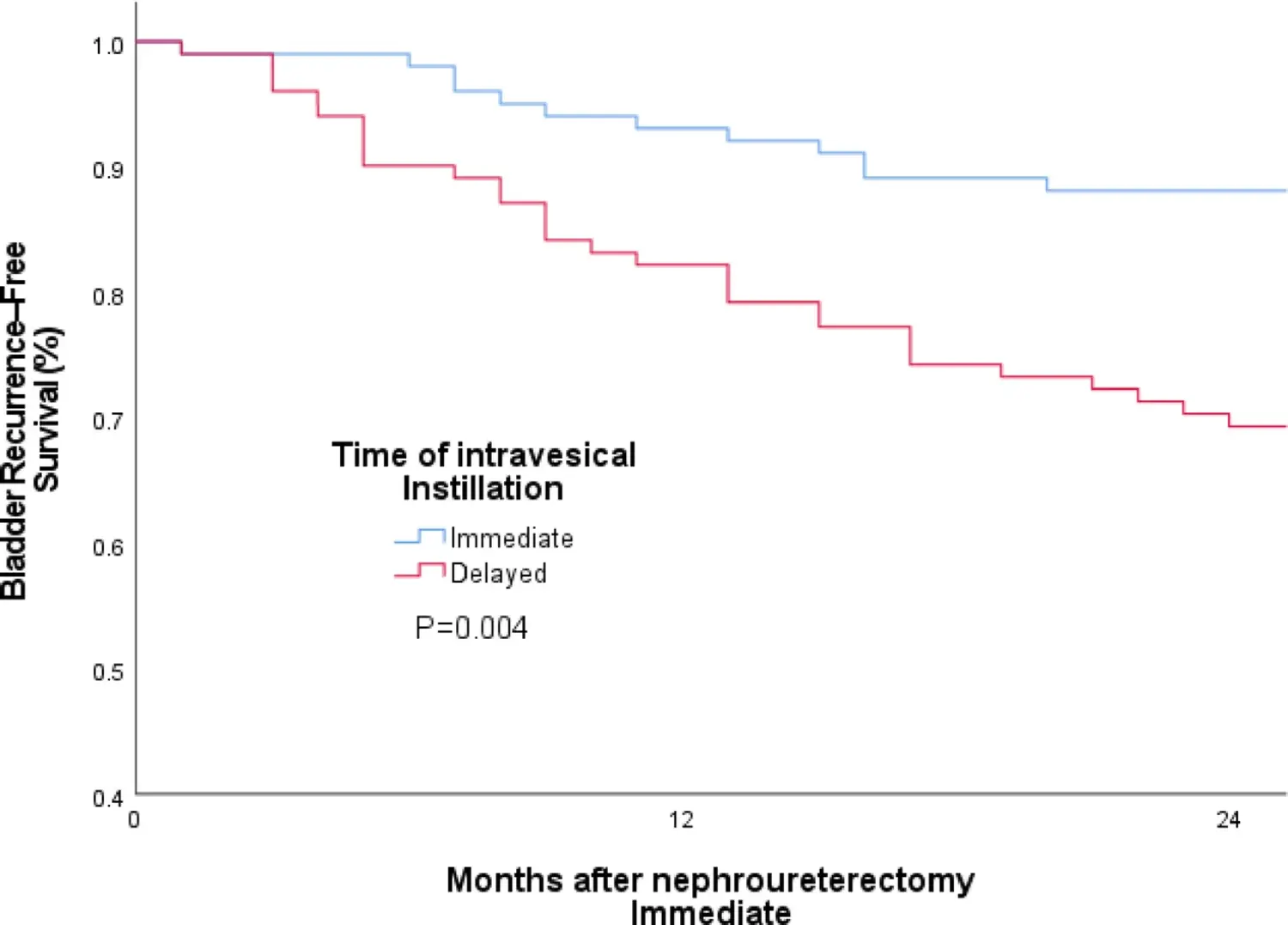 В исследование были включены 418 пациентов (115 в группе немедленного введения препарата и 303 в группе отсроченного введения). После сопоставления по индексу соответствия (PSM) в каждой группе было успешно сопоставлено по 101 пациенту. Двухлетняя выживаемость без рецидива заболевания мочевого пузыря была значительно выше в группе немедленного введения (84,2%), чем в группе отсроченного введения (77,2%, P = 0,004). Анализ подгрупп показал: среди пациентов, которым была проведена предоперационная уретероскопия, выживаемость без рецидива заболевания мочевого пузыря составила 76,7% в группе немедленного введения против 48,0% в группе отсроченного введения ( P = 0,035); среди пациентов без предоперационной уретероскопии выживаемость без рецидива заболевания мочевого пузыря составила 87,3% в группе немедленного введения против 73,7% в группе отсроченного введения ( P = 0,029). Различий в частоте нежелательных явлений, связанных с введением препарата, между двумя группами не наблюдалось.