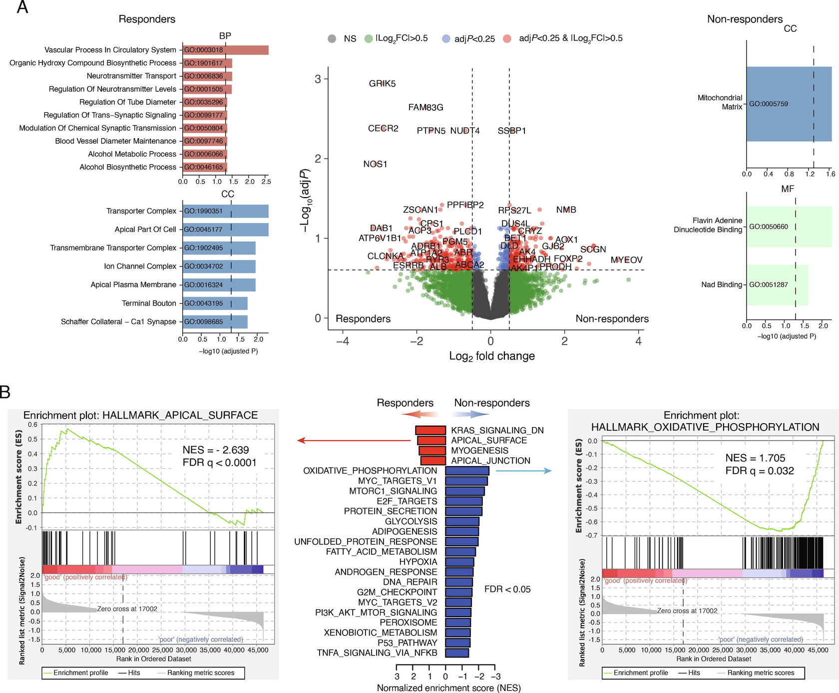 Дифференциальная экспрессия между респондентами и нереспондентами. (A) Дифференциально экспрессируемые гены (ДЭГ), показанные в виде вулканической диаграммы, между респондентами и нереспондентами. Функциональная онтология генов, сверхэкспрессируемых у респондентов, включает гены, связанные с апикальной частью клетки (левая панель) (результаты анализа DESeq2). Гены, экспрессия которых повышена у нереспондентов, в основном участвуют в митохондриальном матриксе и связывании флавин-аденин-динуклеотида в категории МФ (правая панель). (B) Анализ обогащения наборов генов с использованием набора данных Hallmark показал, что пути апикальной поверхности/соединений были обогащены у респондентов, в то время как пути, связанные с окислительным фосфорилированием, клеточным циклом, гипоксией и репарацией ДНК, были обогащены у нереспондентов. BP = биологический процесс; CC = клеточный компонент; FC = изменение в кратности; FDR = частота ложных срабатываний; NS = не значимо.