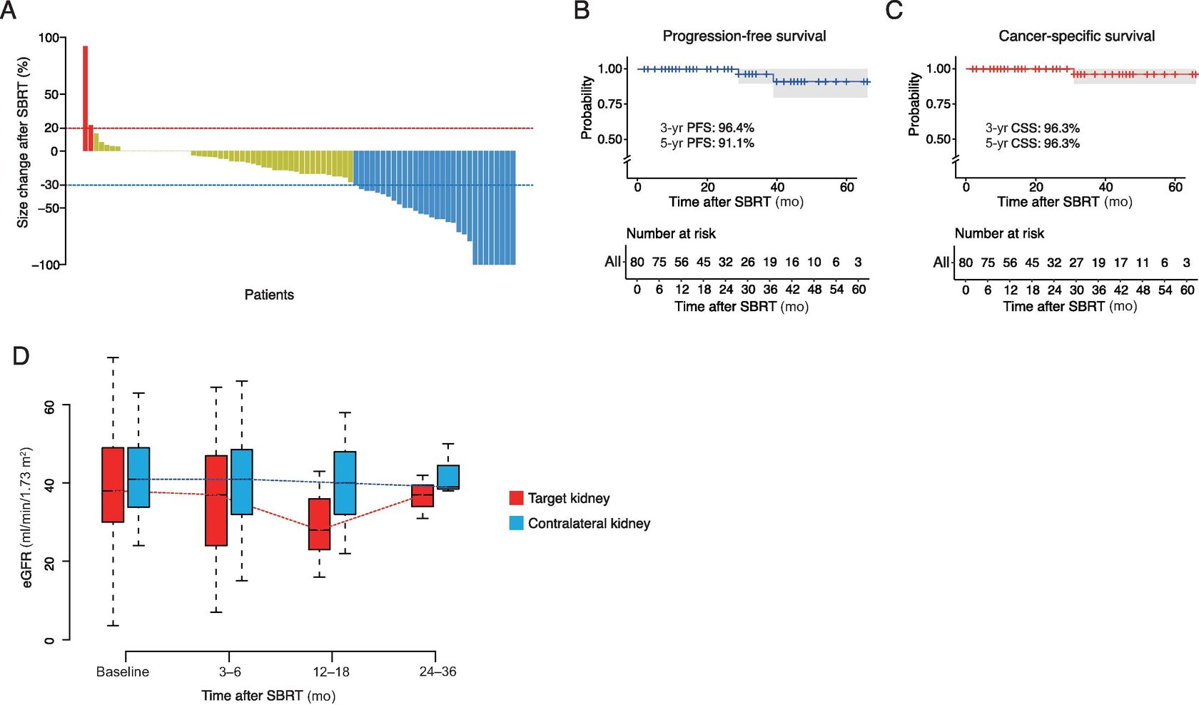 Онкологические исходы и функция почек после стереотактической лучевой терапии (SBRT). (A) График максимального процентного изменения размера опухоли от исходного уровня после SBRT при первичном раке почки. Кривые Каплана-Мейера для 3-летней (B) выживаемости без прогрессирования (PFS) и (C) опухолево-специфической выживаемости (CSS). (D) Изменения расчетной скорости клубочковой фильтрации (eGFR) с течением времени в каждой почечной единице.