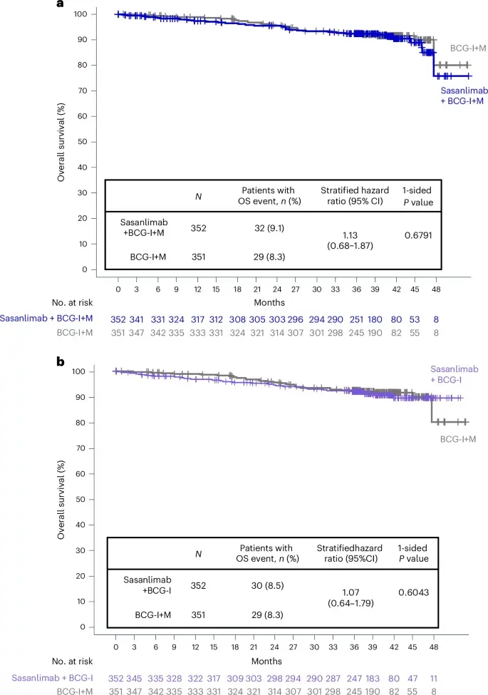 a) Кривые Каплана–Майера общей выживаемости (ОВ): сасанлимаб + БЦЖ (индукция + поддержка) по сравнению с БЦЖ (индукция + поддержка).