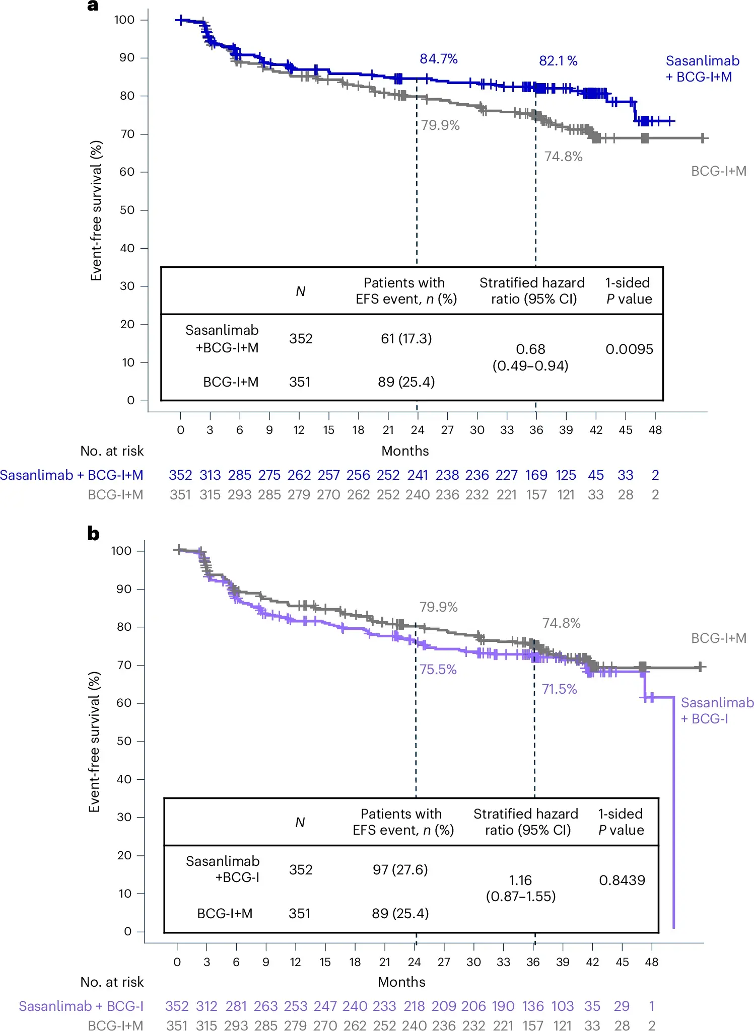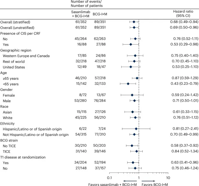В основной сравнительной группе (сасанлимаб + БЦЖ индукция + поддержка) продемонстрировано снижение относительного риска события на 32% по сравнению с контрольной группой (HR 0,68).